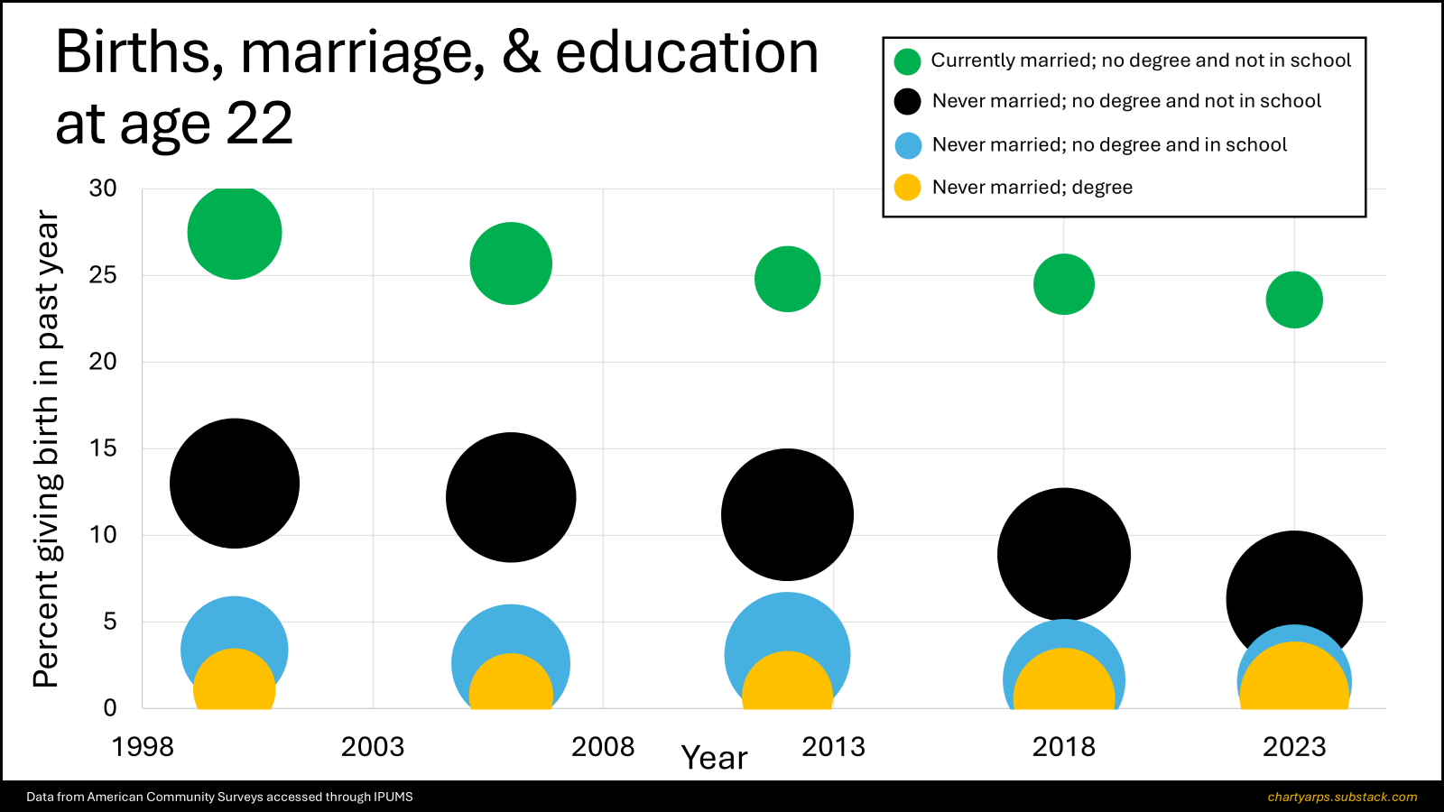 The next chart shows 22-year-olds, where again the main story is the decline in fertility among those who had never married and who left school without having earned a college degree (the black circles). For 22-year-old women in 2000 (late Gen Xers born around 1978), 13% had had a child in the past year. Go forward to 2023 (Gen Z women born around 2001), and this has dropped to around 6%.