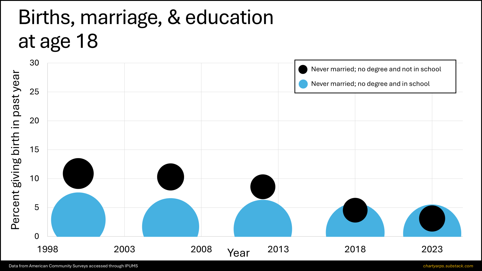 And so, the immediate causes of our current dip in fertility? It’s partly a continued general shift towards education and away from marriage, along with a sharp drop specifically in the fertility of women in their teens and early 20s, and especially among never-married young women who are not in school.
