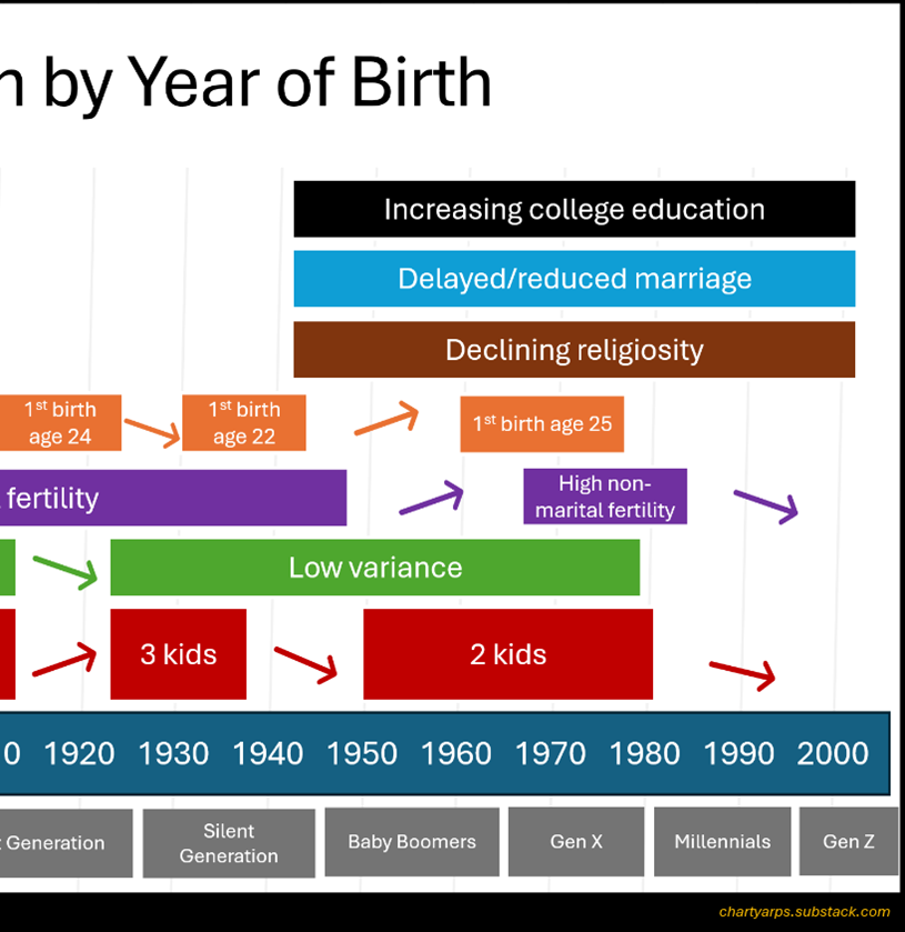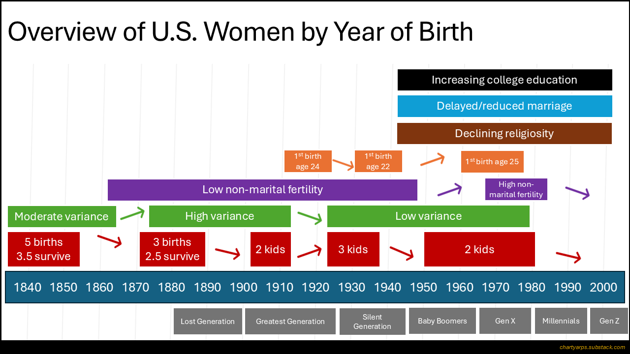 Now we’ll zoom in on the part of the story we’re all more familiar with. I’ve clipped below the latter half of the big picture we started off with above. These are the generations we know by name. The modern story typically begins with the Baby Boom, when fertility rose after WWII and stayed high until falling back down during the Sexual Revolution of the 1960s and 1970s. The peak baby makers were the women born from the early-mid-1920s to the late-mid-1930s. They averaged 3 children with a low variance pattern; only around 10% had no children and the middle 60% had between 2 and 4 children.